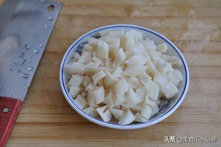 把皮削掉之后就可以把准备好的莲藕切成小块了,再切的时候也要尽量的切的小一些,等到切好以后准备一个榨汁机或者是破壁机,把切好的莲藕放在机器里边,然后再加入少许的清水打成泥,再打的时候可以多打几次,这样打出来的泥也会更加的细腻一些。