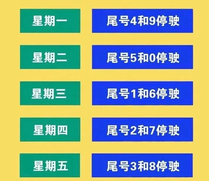 星期一限行4和9,星期二限行5和0,星期三限行1和6,星期四限行2和7,星期五限行3和8。尾号为英文字母的以最后一位数字为准(含外埠机动车)。特殊时段及重污染天气期间限行措施另行通知。