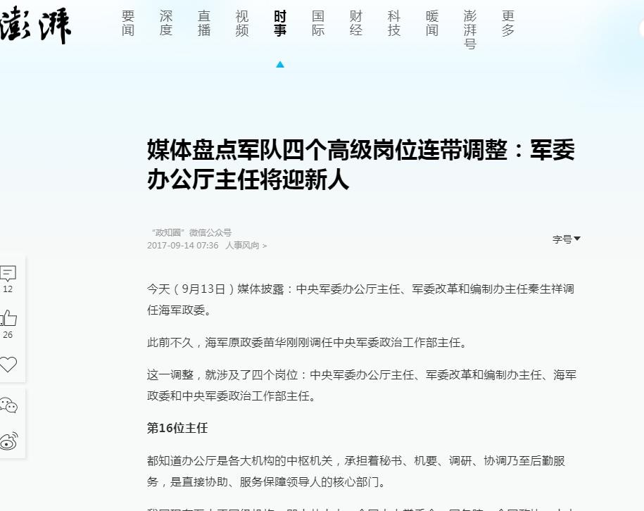 澎湃新闻,媒体盘点军队四个高级岗位连带调整:军委办公厅主任将迎新人