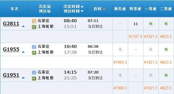 12306客服人员:“给我们的通知是两趟,但具体时间没有,肯定比普通车要快很多。按照北京到上海的距离,大概是5个多小时,石家庄到上海可能要慢一些,大概有6、7个小时。”由此估算,石家庄到上海的车程至少将缩短近10个小时。
