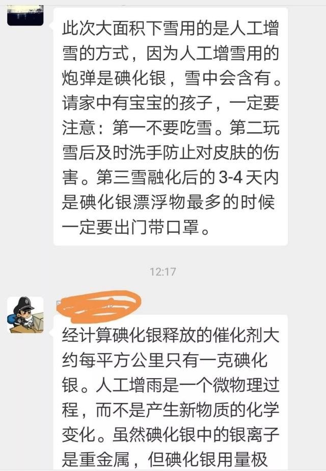 然而,在大家微信朋友圈里,不少网友转发了这样一条消息,“此次大面积下雪用的是人工增雪的方式,因为人工增雪用的炮弹是碘化银,雪中会含有。请家中有宝宝的孩子,一定要注意:第一不要吃雪。第二玩雪后及时洗手防止对皮肤的伤害。第三雪融化后的3-4天内是碘化银漂浮物最多的时候 一定要出门带口罩。”