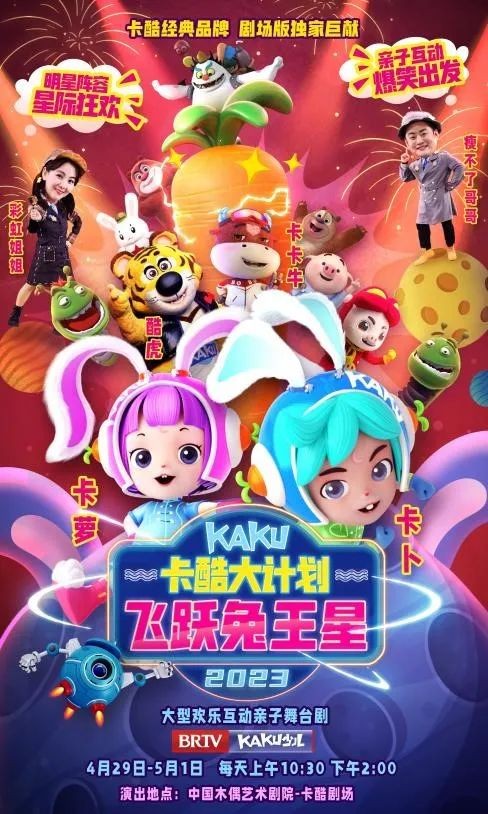 演出时长:70分钟(其实现场加上热场互动,全程约90分钟呢)这个五一假期,卡酷少儿卫视原创大型欢乐互动亲子舞台剧《卡酷大计划之飞跃兔王星》惊喜返场,闪耀归来!