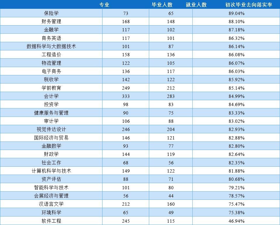 2023 届本科毕业生分布在 26 个专业 ,其中初次毕业去向落实率相对较高的专业为“保险学”(89.04%)、“财务管理(会计学院)”(88.10%)、“金融学”(87.18%)等。