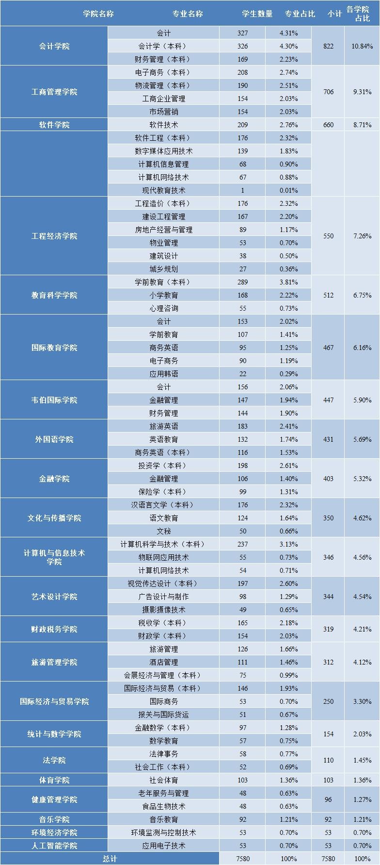 2023 届毕业生共 7561 人,其中本科毕业生 3623 人,占毕业生总人数的47.92%;专科毕业生 3938 人,占毕业生总人数的 52.08%。学校 2023 届毕业生中,男生 2681 人,女生 4880 人,男女性别比为 0.55:1。以“省内生源”为主,所占比例为 95.85%。从各学历层来看,女生人数均多于男生。2023 届本科毕业生初次毕业去向落实率为 81.20%,主要去向为“协议和合同就业”(68.87%)。