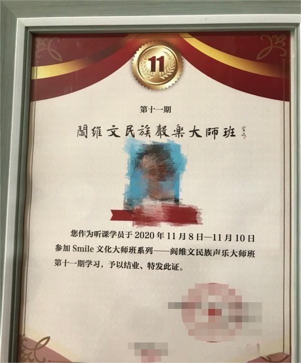 而且就在前不久网上突然爆出来一张阎维文学生的“毕业证书”!格外引人注目的就是那上面明晃晃的大字“阎维文声乐大师班”。
