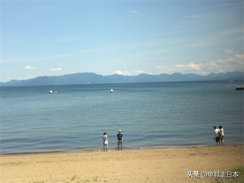 4.湖边的蓝天,远处的山峰连绵不绝。天空的颜色和湖水的颜色完全一致。