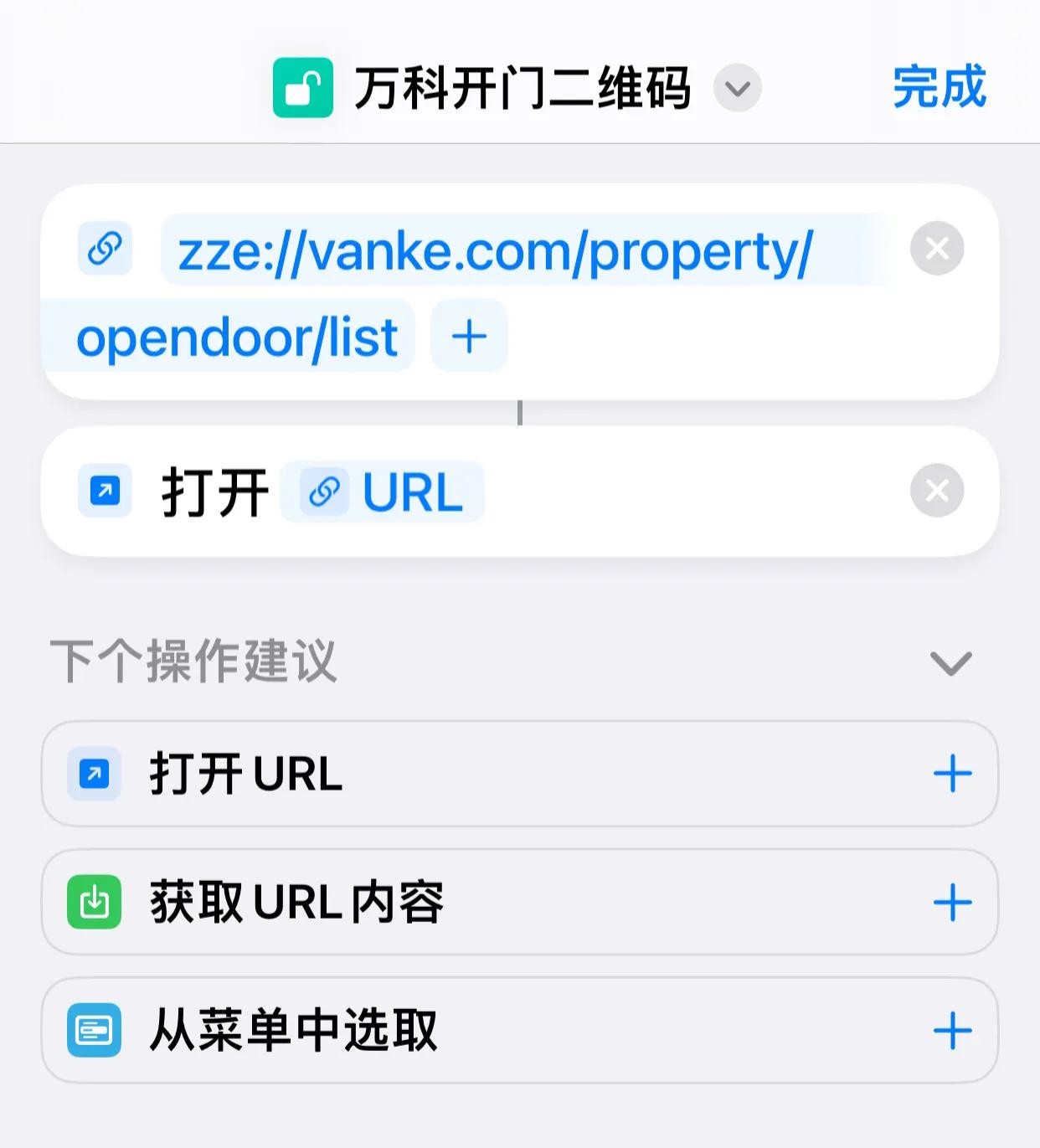 打开手机自带的快捷指令APP,新建一条指令,指令只需要两步。作用还是利用住这儿的scheme url直接打开手机开门界面。