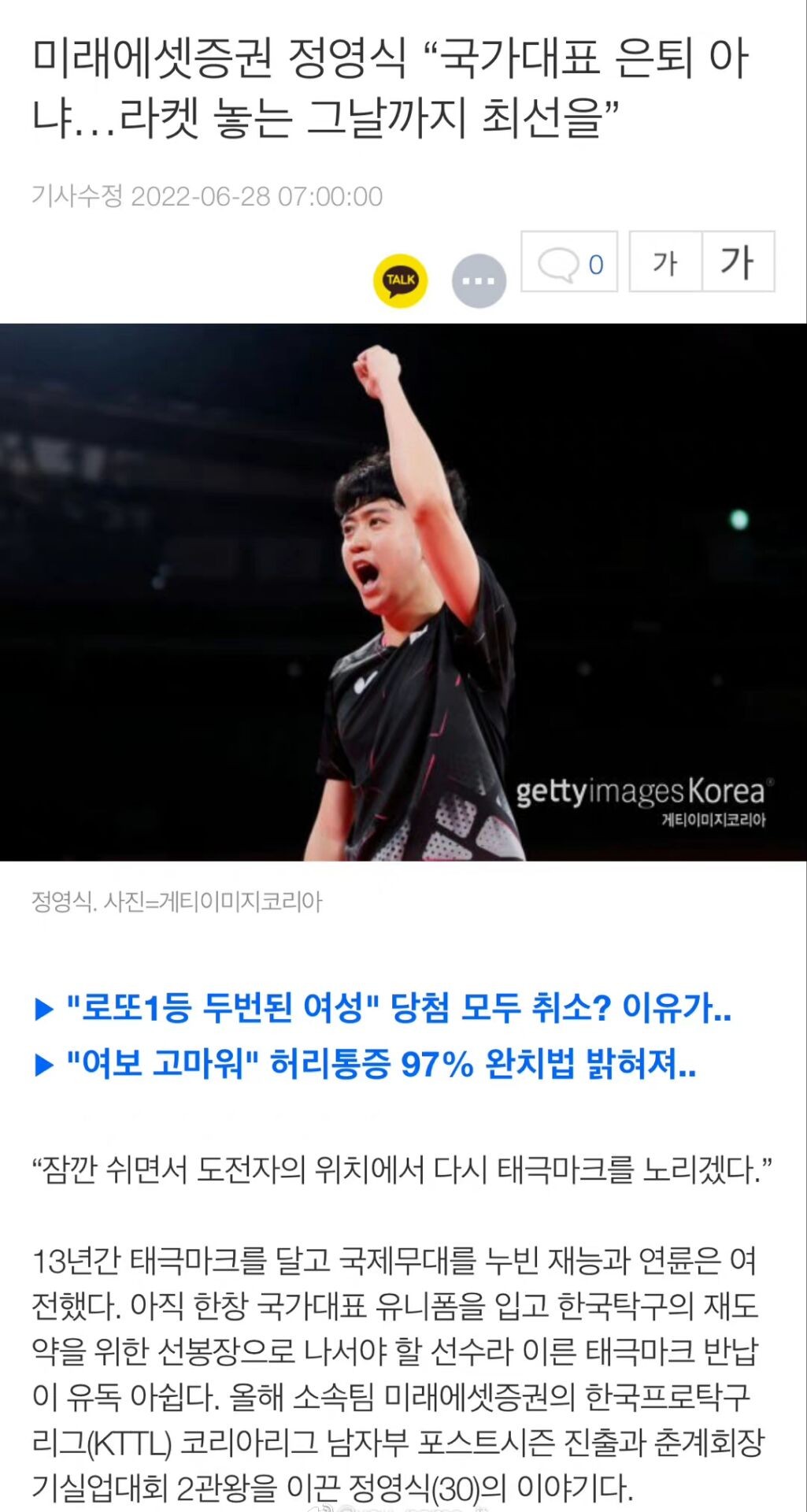 韩网新闻也是发布了关于郑荣植的相关采访,他说:“退出国家队并不代表退役,我想一边打国内联赛一边冷静下来给自己充电。在乒乓球台上全力以赴的想法没有改变。我会稍作休息,以挑战者的位置再次瞄准国家队。”