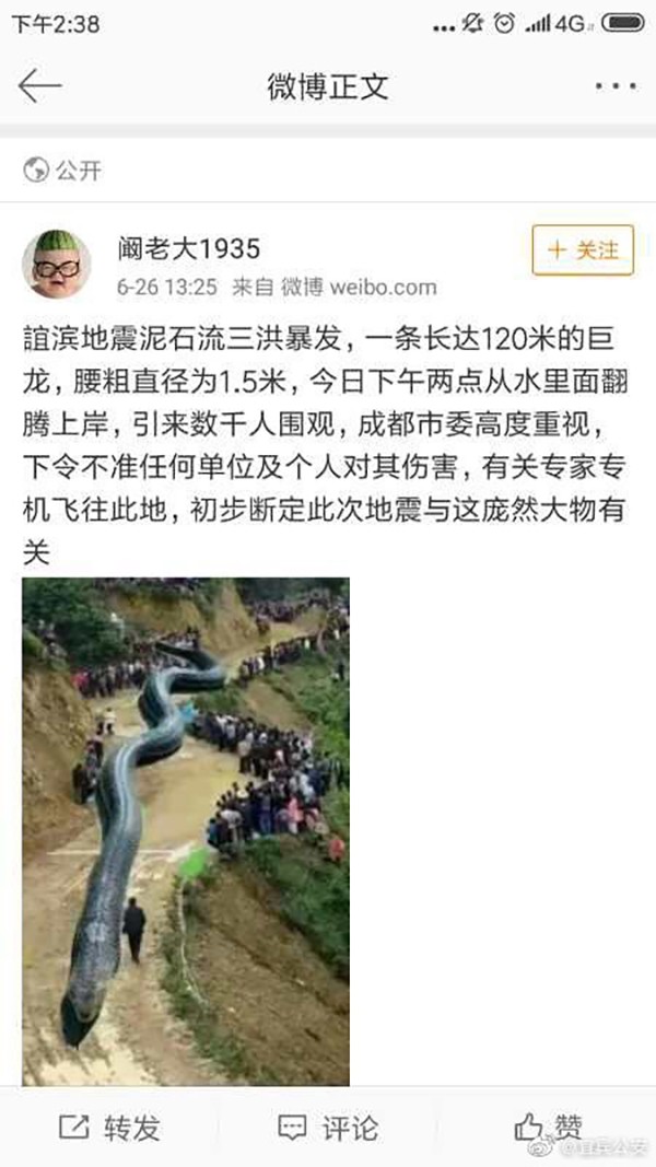 7月4日,四川省宜宾市公安局在其官方微博发布消息称,在2019年“6.17”宜宾长宁6.0级地震后,网上很快流传出灾区出现一条“巨龙”谣言,引发广大网民的极大关注和社会恐慌。为回应网民和社会的关切,@宜宾网警巡查执法 队迅速成立专案组开展周密仔细调查工作并成功锁定违法嫌疑人。