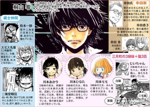 漫画「三月的狮子」是羽海野千花创作,先崎学监修,于2007年在日本白泉社旗下YoungAnimal上连载的漫画作品,漫画是以将棋为题材的,围绕各种各样的人展开的温馨故事。本作曾获得过由朝日新闻社主办的第18回“手冢治虫文化奖”大奖、2011年的漫画大奖、第35会讲谈社漫画奖一般部门奖等奖项。