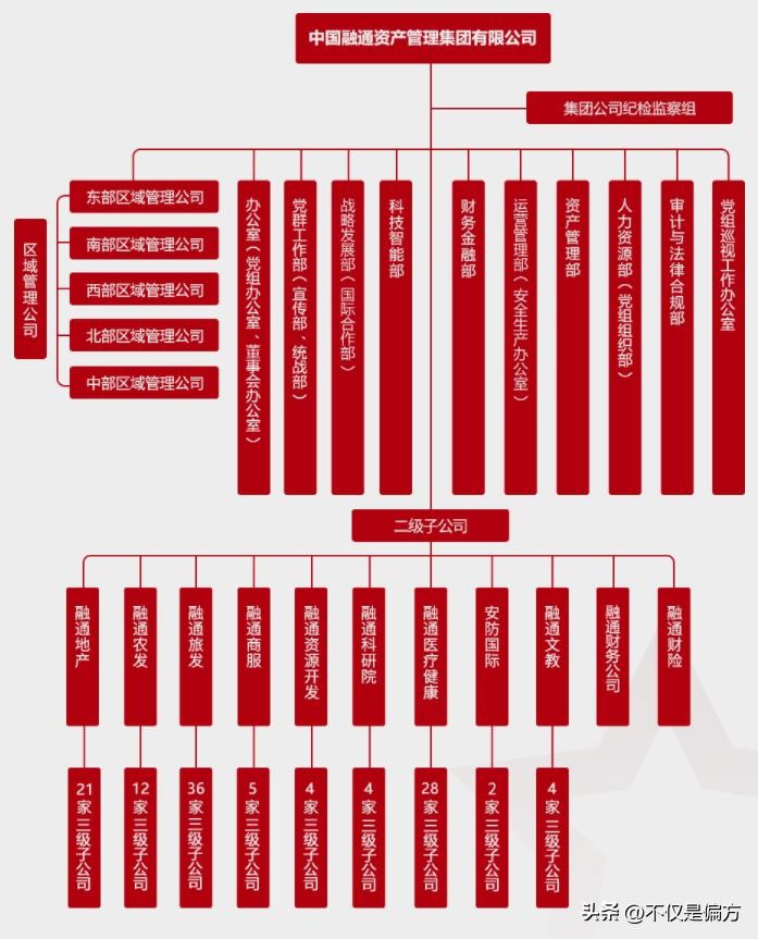 据融通集团官网介绍,该集团的经营范围主要包括“房地产、农业、酒店及旅游业、商业服务、资源开发、科技服务、医疗健康、安保服务、文化教育、财务、保险”等领域。官网的组织架构图下图所示,左侧的区域管理公司是不是感觉有一种熟悉的味道,应该是分别对应五大军区:东部战区、南部战区、西部战区、北部战区、中部战区。