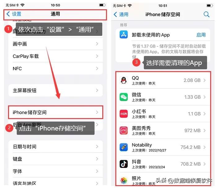 分别打开【设置】>【通用】;在通用页面中选择【iPhone存储空间】,等待加载完成后,选择需要清理的App;点击进入后,选择【删除App】或者【清除App缓存】来清理缓存。