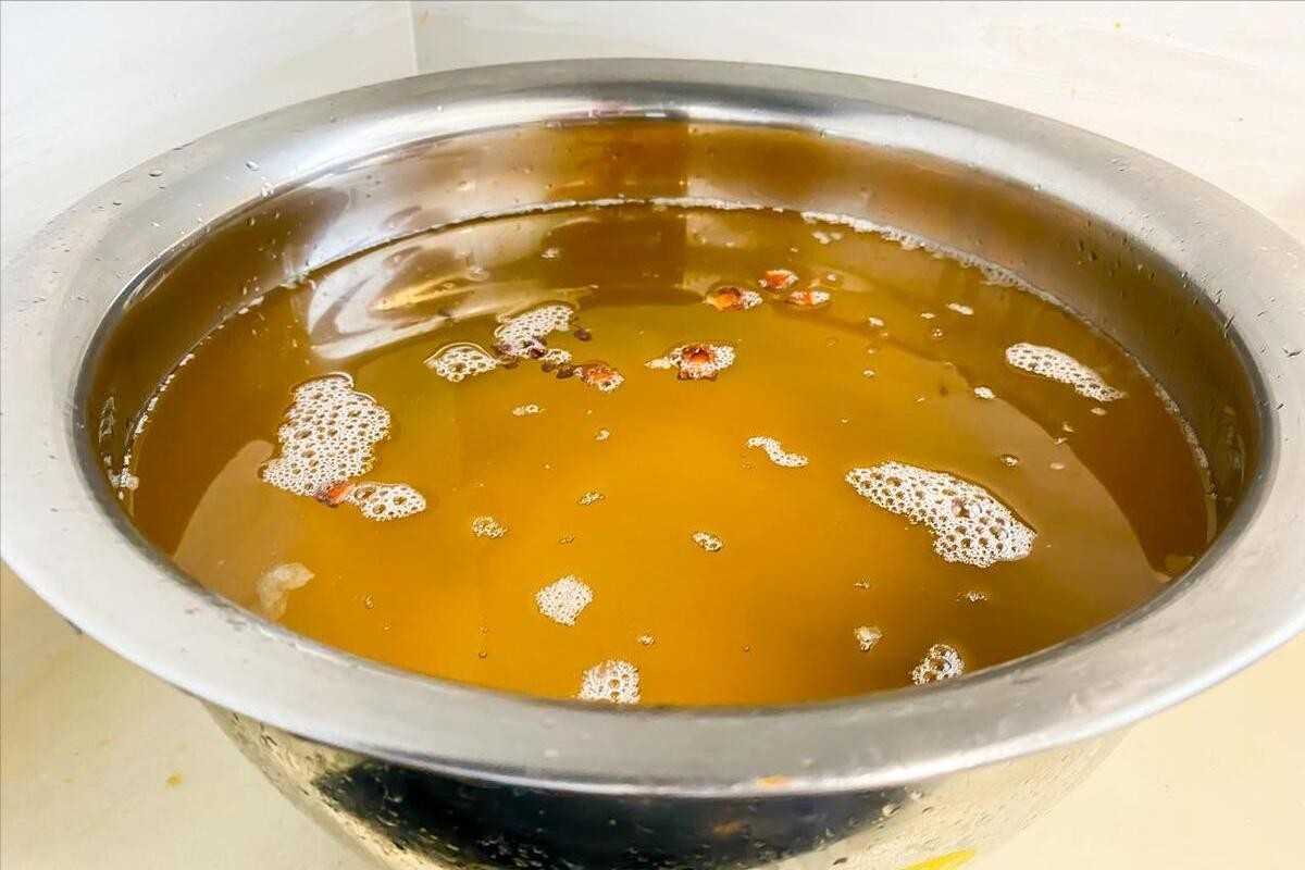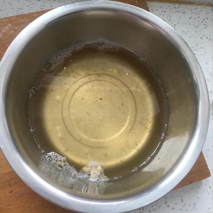5、熬制一段时间,等到猪板油的颜色变成黄色,等到猪板油的状态变成小小的、干干的,那就说明猪板油已经被熬干了,里面的油分基本上都熬出来了,这个时候咱们把猪板油,现在变成猪油渣了,捞出来扔掉。