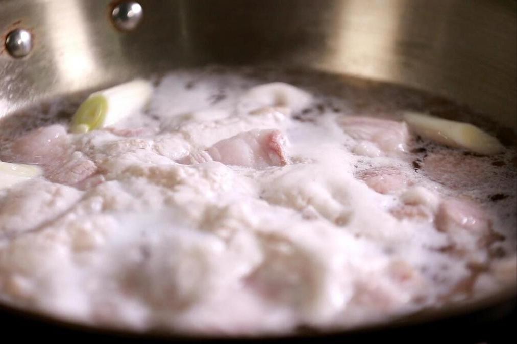 3、当然了,焯水这一步也可以忽略掉,看自己吧,重新准备好干净的锅子,将猪板油倒进去,重新往里面倒水,但是水量不要太多了,大概就半碗的量即可。倒上清水以后,就可以开火了,开始熬制。