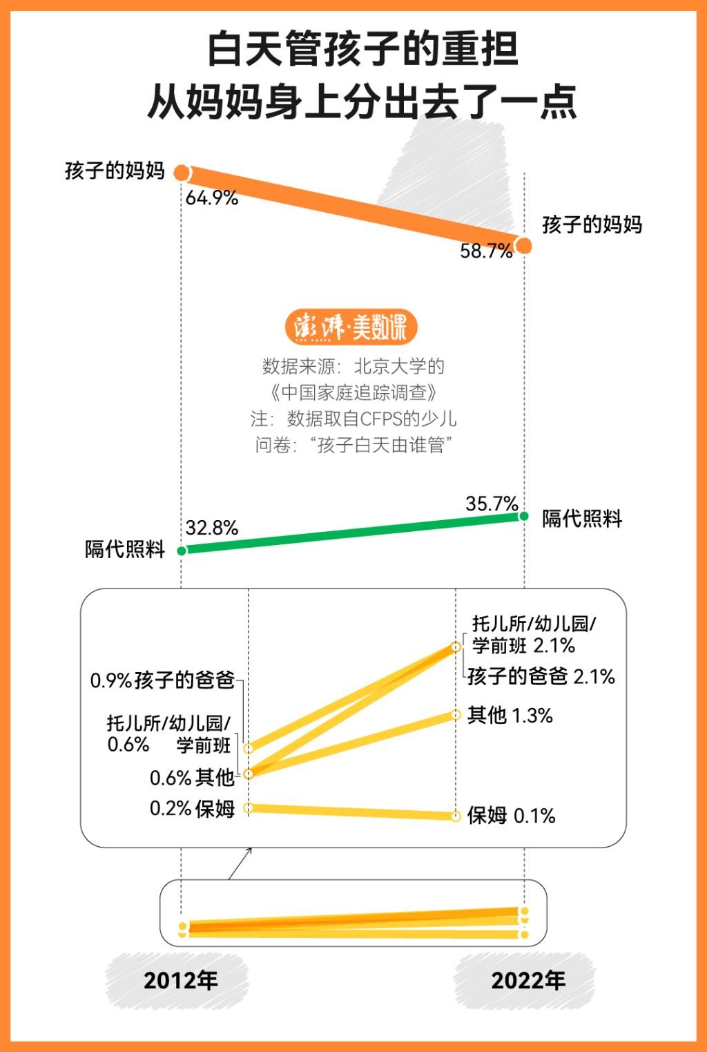 2022年CFPS的数据显示,10年间,家庭中女性的照料负担稍微减少了一点,部分爷爷奶奶和外公外婆开始带娃了。