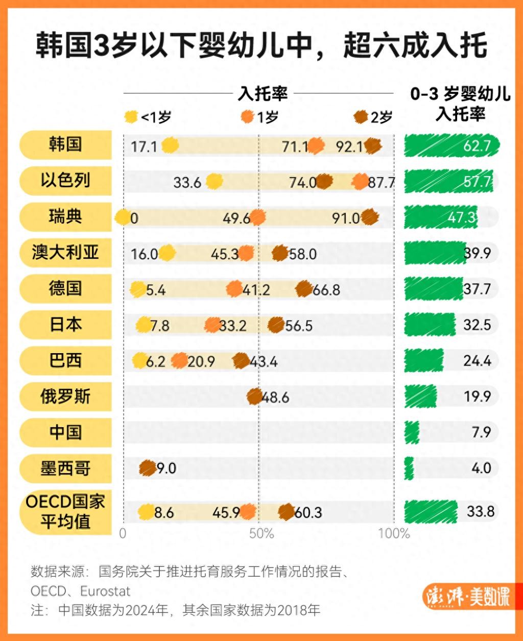 作为全球生育率倒数的国家,日韩为了让年轻人生孩子使出“浑身解数”,提供了优厚的托育政策。这两个国家的入托率在连年攀升。