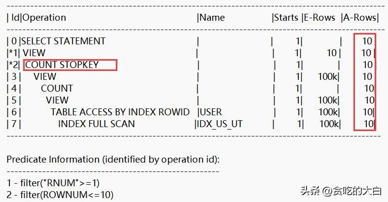 (2)执行INDEX FULL SCAN时访问10条记录后,已经满足分页要求,扫描终止,该SQL语句执行完毕。即上图执行计划中的COUNT STOPKEY(COUNT STOPKEY一旦获取到满足分页条件所需的记录后即停止SQL语句的执行)操作;