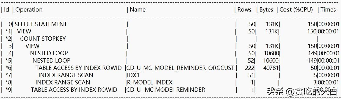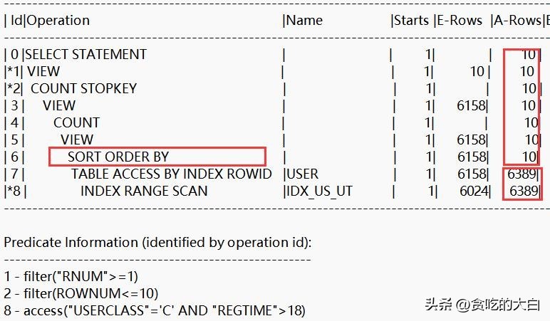 (3)执行计划中没有诸如SORT ORDER BY、SORT ORDER BY ROWNUM之类的排序操作,说明以上SQL语句执行时利用了索引消除了排序操作。