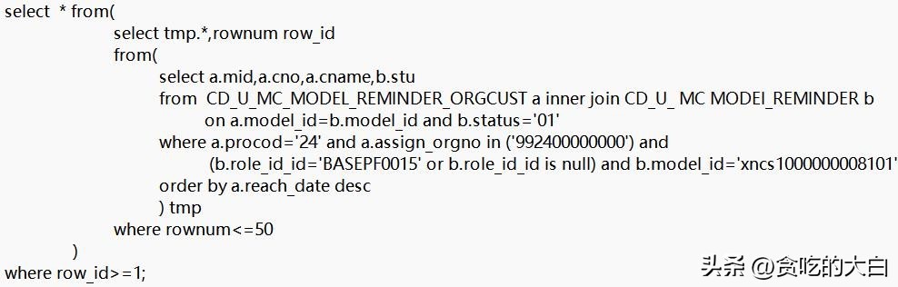 CD_U_MC_MODEL_REMINDER_ORGCUST(A)和CD_U_ MC MODEI_REMINDER(B)表执行关联,并进行分页操作,排序后获取前50条记录,SQL语句如下。