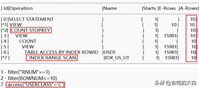 (2)执行INDEX RANGE SCAN时访问10条记录后,已经满足分页要求,扫描终止,该SQL语句执行完毕。即上图执行计划中的COUNT STOPKEY操作;