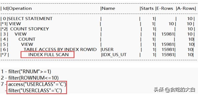 过滤执行时为执行计划中id为7中对应的access和filter两种方式的结合,该方式说明在使用userclass列上索引访问user表时在执行索引扫描的同时又执行了对记录的过滤操作。具体操作为:扫描索引时,同时对每条索引按照过滤条件,如果符合过滤条件的记录达到分页操作指定的10条后,扫描停止。