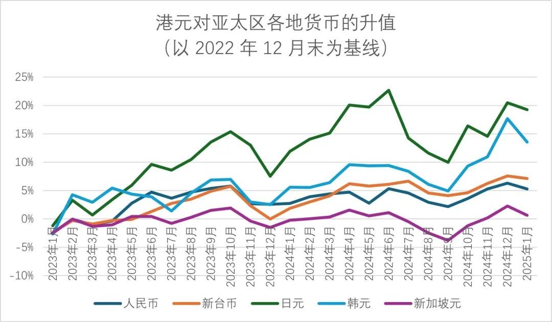 从2022年底以来,港元对人民币和新台币升值了6%左右,对韩元、日元升值了15%左右。在这样的局面下,外地变便宜了,港人当然会往外跑;香港变贵了,外地人自然会少来香港。