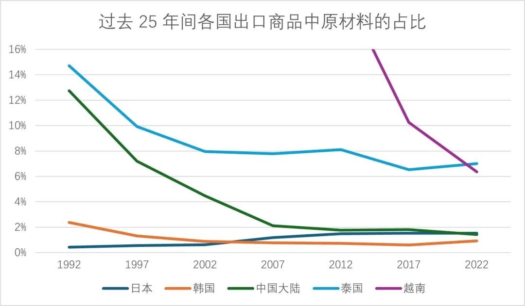 1992年到1997年,泰国和中国还可以说是一道产业升级的“战友”:五年间泰国原材料出口占比从15%降到10%,中国从13%降到7%。但是,1997年到2022年整整25年,泰国出口结构当中原材料占比从10%降到7%,被越南(从2002年的40%降到2022年的6%)迎头赶上,甚至最近几年还有回升的趋势;而与此同时,中国大陆出口结构中原材料已经从7%降到了和日韩等发达国家接近的1%左右。