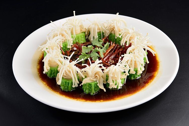主料:苦瓜500g、金针菇150g、扇贝裙边10个辅料:干辣椒丝2g、八角1个、花椒5颗调料:蒸鱼豉油100g制作:1、将苦瓜切成扳指环状,去掉瓜瓤后汆水备用。2、将扇贝裙边缠在金针菇颈部栽入苦瓜中。3、上蒸箱蒸五分钟取出,成圆形摆盘,中间放辅料泼油,淋上蒸鱼豉油即可。