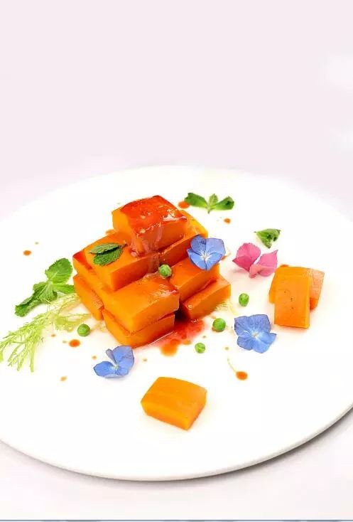 主料:金瓜500g 辅料:薄荷叶5g、苦菊5g 调料:柠檬汁50g、黑加仑汁80g、沙拉酱20g、蜂蜜10g 制作流程: 1、将金瓜洗净,改刀成4cm的正方块备用。 2、在金瓜中加入蜂蜜、水,蒸箱蒸10分钟取出,放凉待用。 3、取柠檬汁50g、纯净水500g、白糖50g浸泡20分钟左右取出。 4、将黑加仑汁80g加入沙拉酱打匀,浇在装好盘的金瓜上即可。
