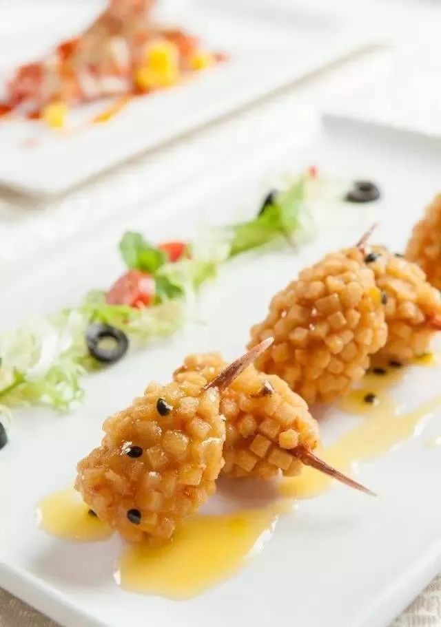 3、将炸好的蟹钳摆盘,淋百香果汁,以苦菊、薄荷叶、腌橄榄、小番茄丁点缀即可。