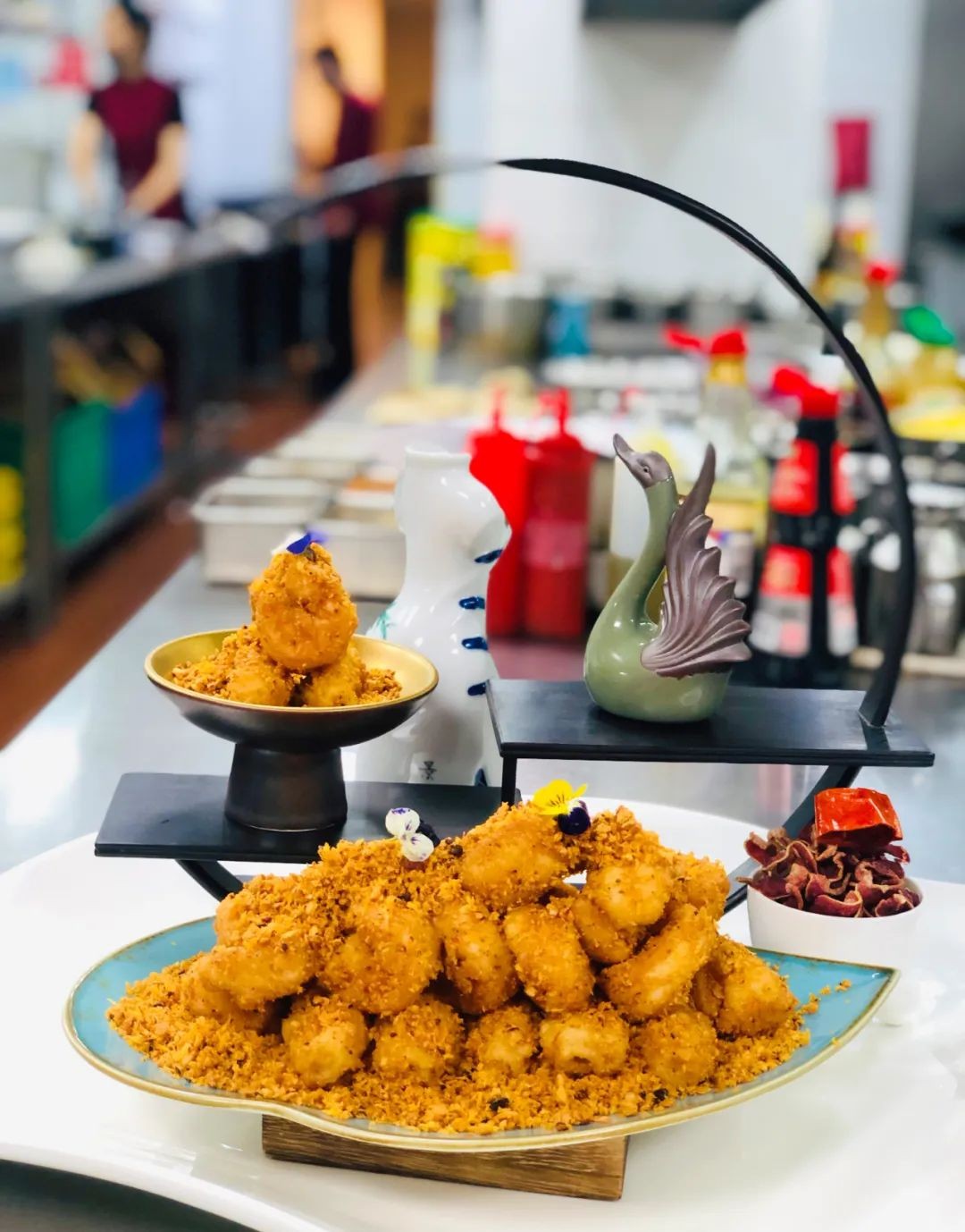 鸡腿做成可爱的山楂形,这道菜单凭着小巧的外表,便能收获一大批女性食客的倾心。调味上,在传统鱼香味的基础上进行了创新,不用食醋,而是以酸梅肉、山楂粉调出天然果酸,另外放入了烤香的虾干茸增添鲜味,成菜颜色红亮,十分开胃。