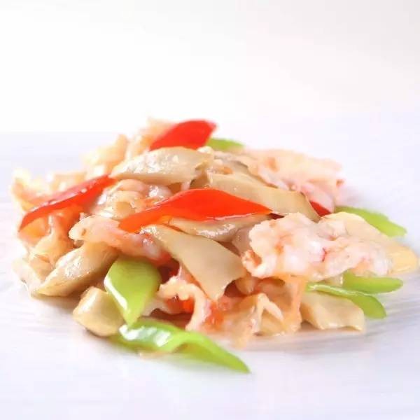 3.再放入青红椒片,最后加入熟制的虾片,炒制片刻,临出锅放入盐、鸡粉和少量高汤简单翻炒,出锅装盘即可。