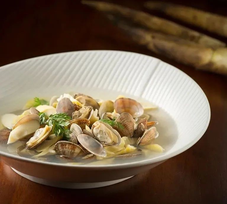 春笋,花蛤,胡萝卜苗,玉泉山矿泉水,二汤,盐,白糖,鸡粉。