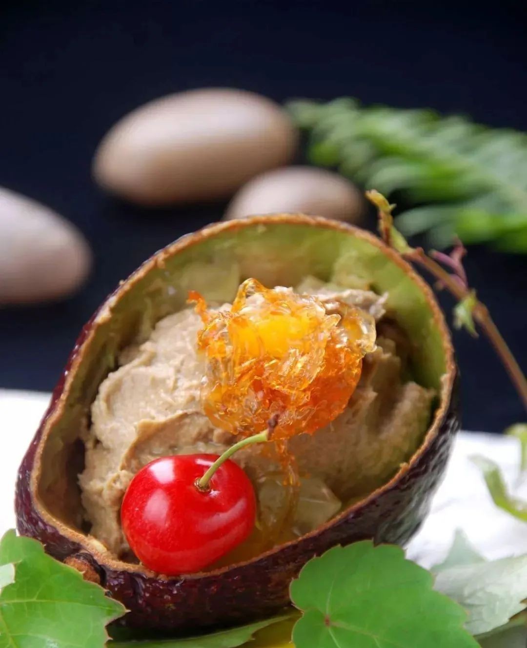 2.把牛油果取果肉,连同花生酱、蛋黄酱和蜂蜜一起放入手持搅拌机,打匀以后再装入牛油果的壳内,最后摆放上血燕,并点缀好樱桃和薄荷叶,即成。