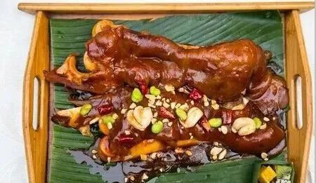主料:牛蹄400克 、鲜蘑100克 花生碎30克 调料:鲜辣汁10克 葱姜20克 糖10克 盐15克 老抽10克 红曲米15克 麻椒3克 花椒3克 干辣椒5克 东古一品鲜10克 香辣酱10克 辣椒酱8克 制作:1、牛蹄烧皮洗净,放入用鲜辣汁、辣妹子辣椒酱、美味香辣酱、东古一品鲜、干辣椒、花椒、麻椒、红曲米、老抽、盐、味精、糖和葱姜调兑成的卤水中卤制3小时,至皮肉将离骨时捞出,控净汤汁放入盘中待用;2、取一净锅,加入适量原汁和高汤,调好口味和颜色,勾芡后淋在牛蹄上,鲜蘑沸水后摆在四周,花生碎洒在上面;3、另一净锅加少许葱油,烧热炸香干辣椒,倒在牛蹄上即可。 <创意灵感>牛蹄不但比猪蹄含有更多骨胶原,而且皮下脂肪少,因此入口没有腻滞的感觉,煨得红润酥烂、晶莹甘美后,可以说是老少皆宜。不单主材矜贵,牛蹄上的酱汁更是精华,精心熬制的高汤中创意性地加入了辣酱、红曲、麻椒等调料。令口味更加浓香复合,食牛蹄时,牛蹄的粘稠口感混合酱汁的鲜味,满足得无以复加。