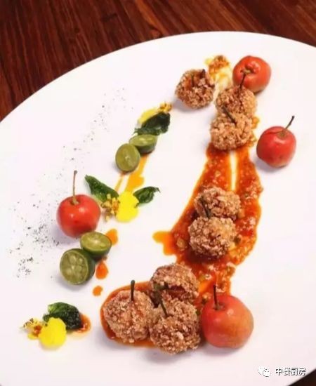 3、锅入底油烧至五成热,下入山楂鱼香汁25克小火加热,撒香葱碎6克搅匀,起锅淋入白盘,上面放炸好的鸡中翅,旁边点缀鲜山楂4个、青柠檬2个(一切为二)、花草,撒少许法香碎即可走菜。