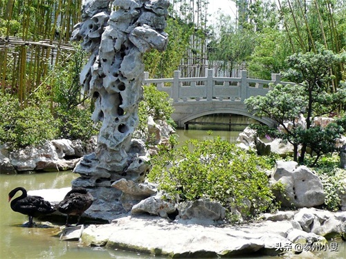 古猗园的园艺布局,从明代起就以戏鹅池为中心,后经清代青至建国后的历次修复和拓扩,都注重挖河理水,使水置于园林,以水为主,相映园景。古猗园的水,与外隔绝,但在百亩之园中,有千米距长的溪流。以方池和狭长形的水面形态,多弯曲折,似园脉络,贯通全园。池岸石驳,凹凸曲折,配植花草,时隐时现。望之不穷,使人并不觉此水无源。而有源远流长之感。戏鹅池如一明镜,映现临水而建的“不系舟”的清晰倒影,不但扩大了园林的空间感,而且给人增添了幽静的情趣。
