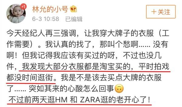 在活动现场公开说自己有小号,还呼吁大家去关注,在小红书上也放上了小号微博名,就叫林允的小号。