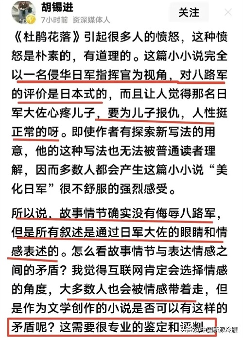 胡锡进的部分观点与公众情绪存在明显冲突,尤其在涉及民族情感和道德底线时: