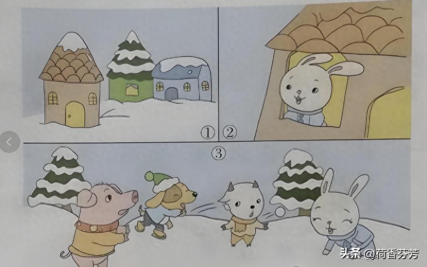 冬天到了,大雪下了一整夜。第二天清晨,小白兔推开窗户,看见原野上堆了一层厚厚的雪,到处都是白茫茫的。树上和屋顶上也堆满了雪,好像铺上奶油的蛋糕。整个世界都变成了童话世界,漂亮极了!