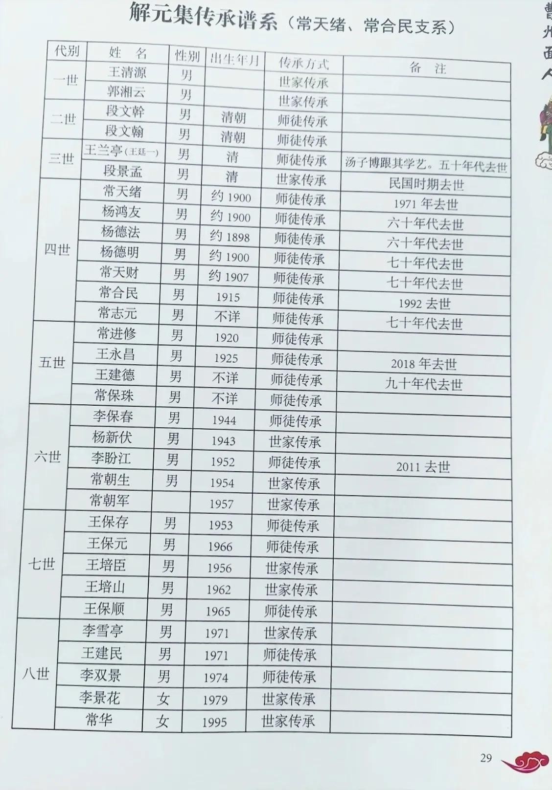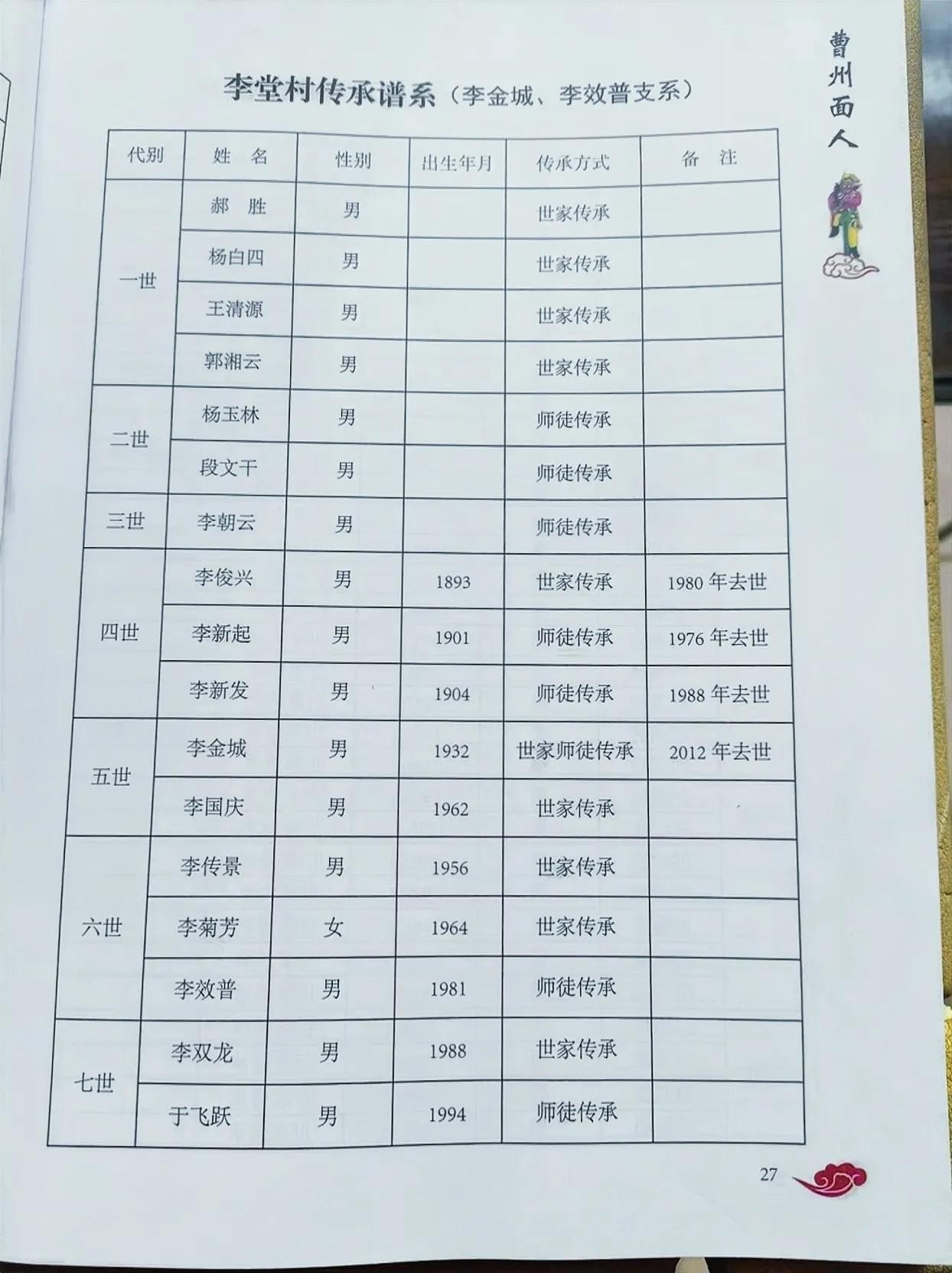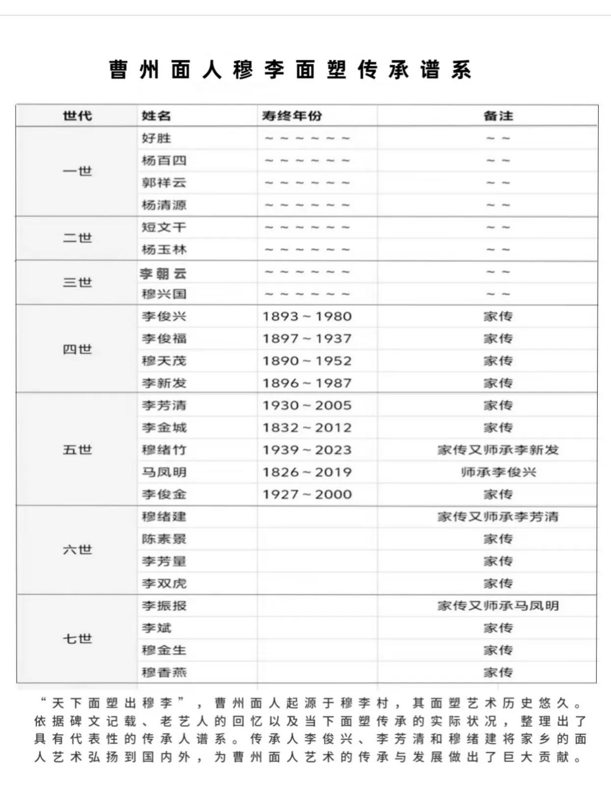 2025年初菏泽地方文化部门出版“曹州面人”新书中曹州面人传承谱系中的六大支系: