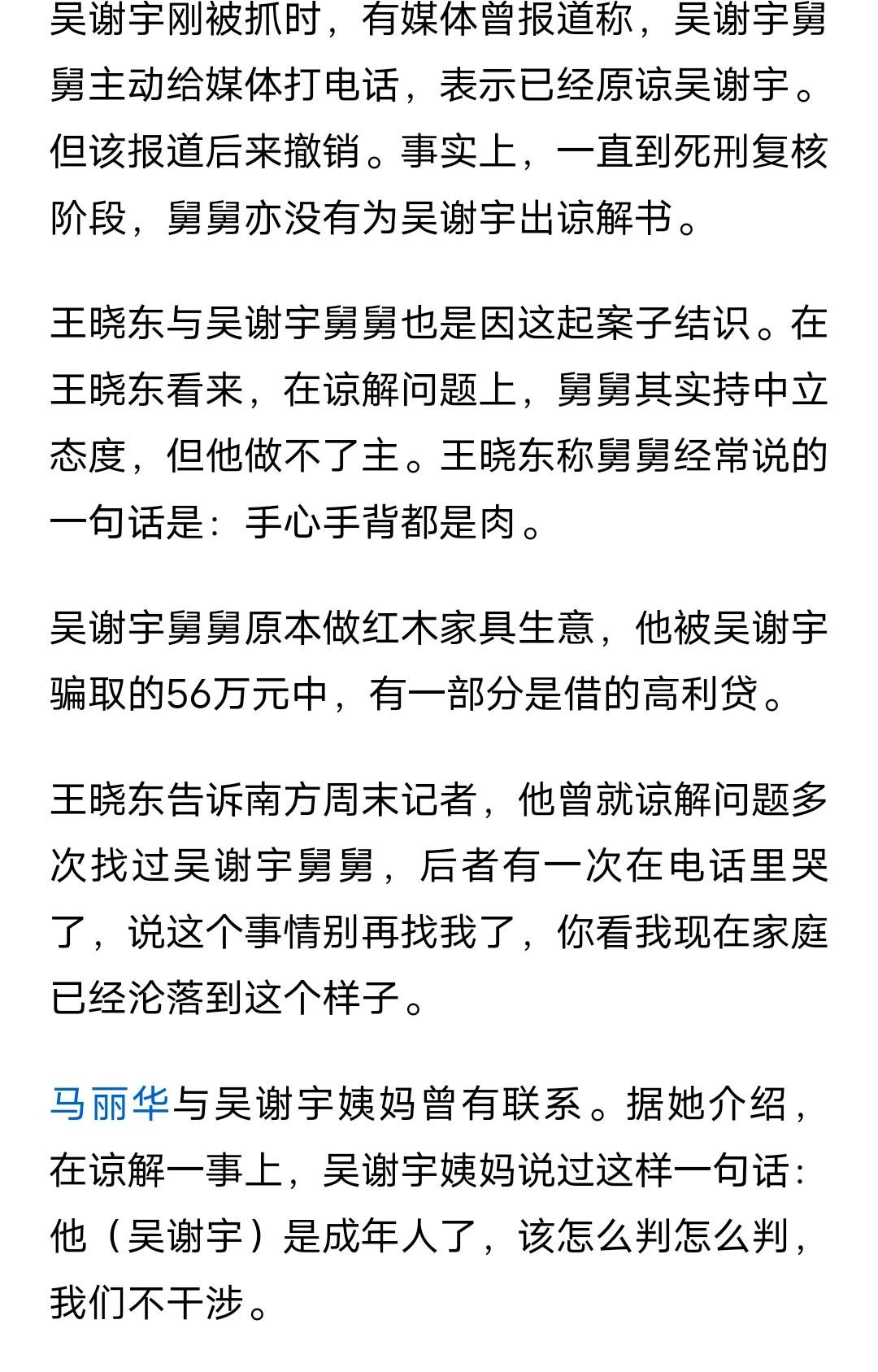 此前有传闻说吴谢宇舅舅谅解了外甥,后来被证实消息是假。该新闻已经被撤下,《南方都市报》采访了吴谢宇父亲的朋友,他称吴谢宇舅舅被骗的50多万里面有一部分是高利贷。而根据此前采访报道吴谢宇舅舅因为这笔钱公司破产,妻子也与其离婚。生活的很窘迫。