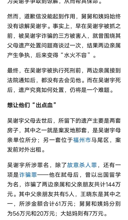 吴谢宇舅舅和小姨都拒绝出具谅解书,在2023年年底,吴谢宇被执行了死刑。但是吴谢宇已经离世三个多月了。他的骨灰一直没人认领,甚至在临终前看守所通知亲属去见最后一面时,吴谢宇姑姑也以身体不适为由没有去。