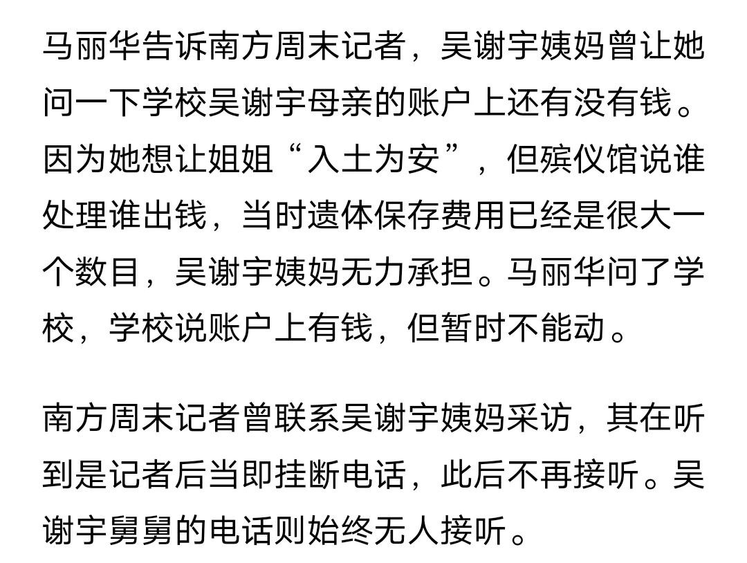吴谢宇骨灰三个月没人领,而他的母亲谢天琴在被害9年后,遗体仍然存放在殡仪馆,吴谢宇姨妈曾问过学校接了账户还有没有钱,因为她想让姐姐入土为安,殡仪馆说谁处理谁出钱,当时遗体保存已经是很大一笔费用,吴谢宇姨妈无力承担,但是学校方面表示谢天琴账号确实有钱,但暂时不能动。