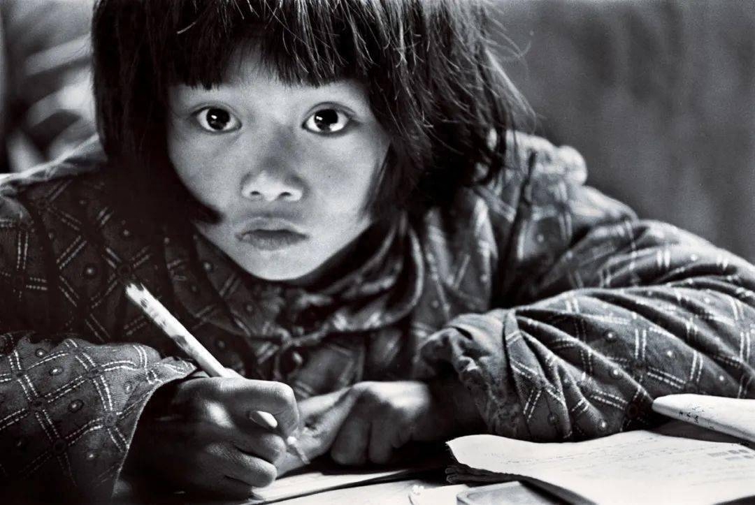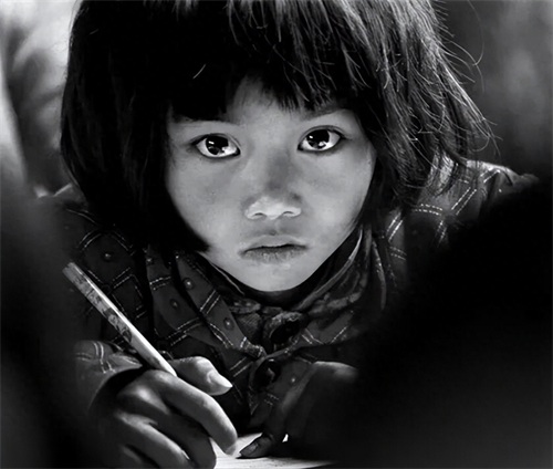 照片中的小女孩,坐在破旧的教室里,身上穿着老旧的衣裳、头上顶着杂乱的头发、手里紧紧的抓着一只铅笔,显得十分凄凉。但与昏暗的环境做对比的是,小女孩瞪着一双乌黑明亮的大眼睛,直直的望着前方,眼里流露着对知识的渴望。