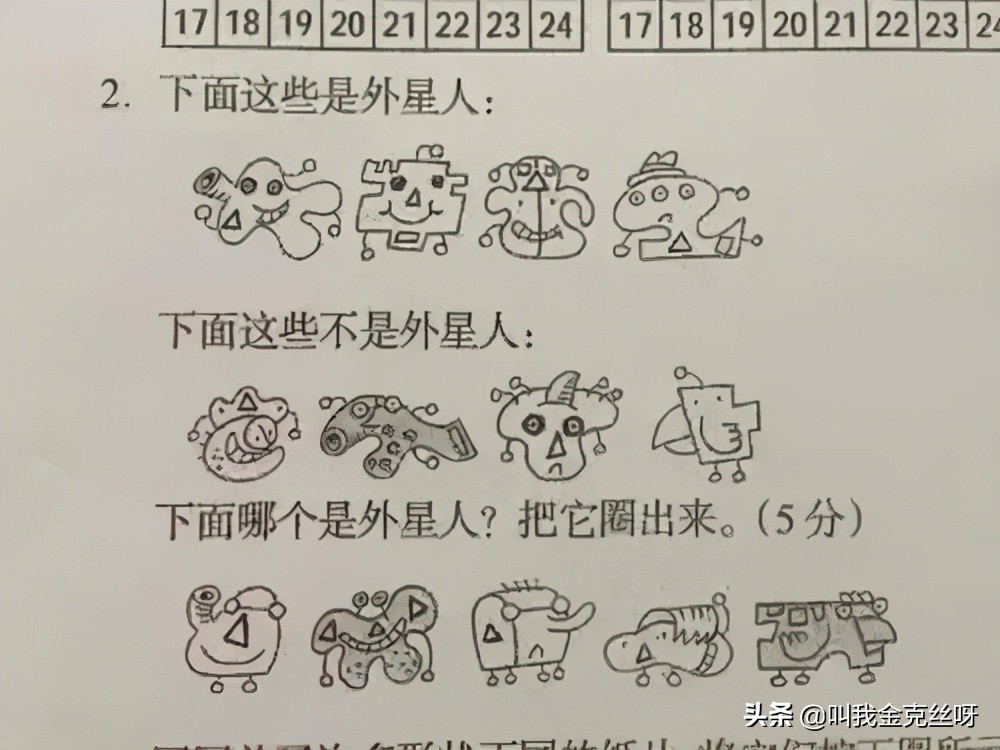 第二题:小编凭借着犀利的眼神,超高的视力,过人的脑力,一眼(万年)就找出了答案——第四个是外星人。根据第一行的图片可以看出,外星人都是有三个触角,一个三角形,第二行的生物没有这个规律。所以可以断定,最后一行五个“生物”,第四个是外星人!掌声送给小编!