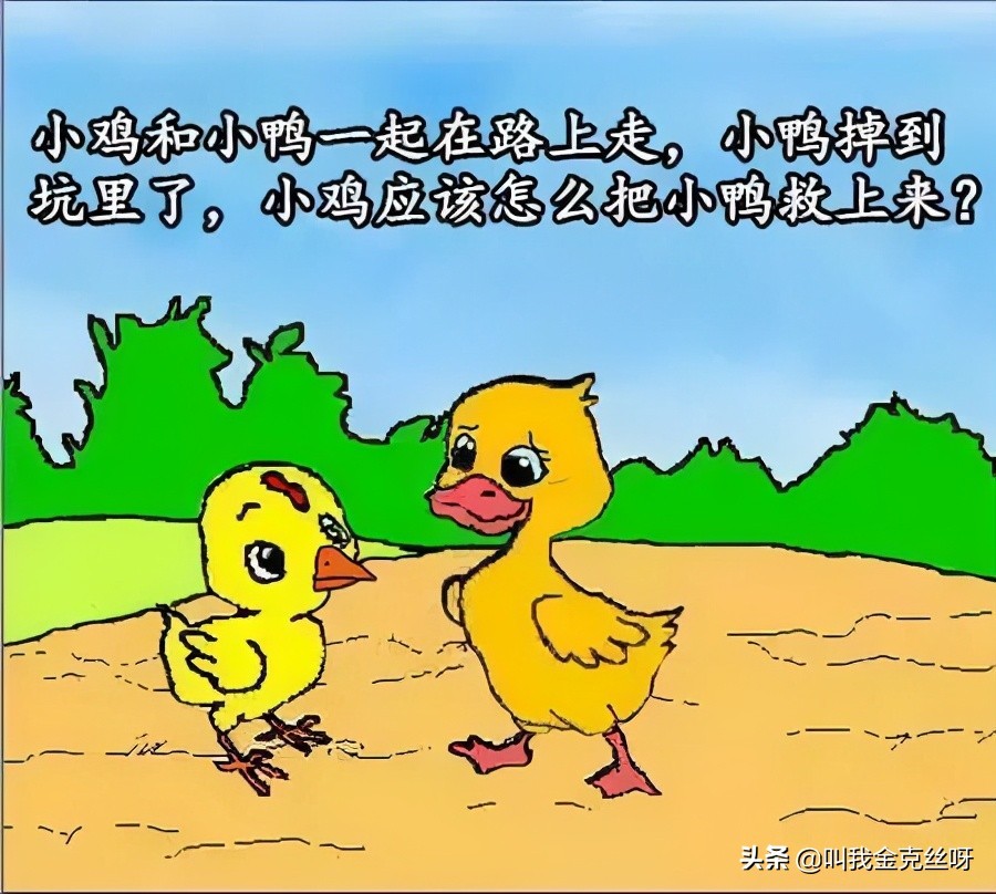 第五题:小编拿手的当然是这种常识题啦。小鸭子掉进坑里,那小鸡去找水管把坑填满,会游泳的小鸭同学就可以游上来啦。小编露出了自(天)信(真)的笑容。这道题我应该可以得满分吧?不接受老师的反驳!