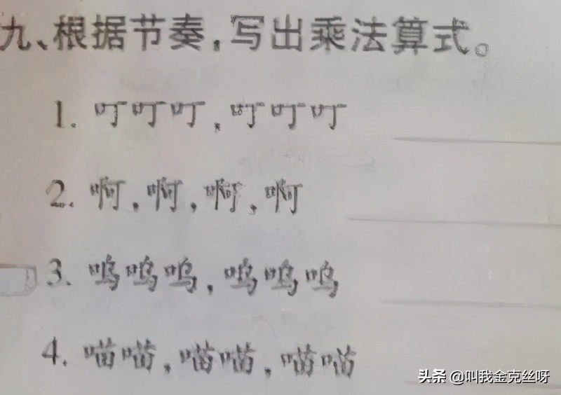 第一题:小编第一眼看过去,以为是语言题,也就是语文老师给的题。但是仔细看了一下题干——“写出乘法算式。”打扰了,小编别说用脚,绞尽脑汁都无法把“呜呜呜喵喵喵”这些拟声词和乘法表联系在一起。