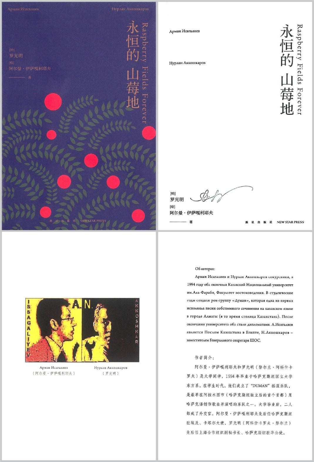 本次赠送的书籍是由哈萨克斯坦驻华公使、哈萨克斯坦常驻上合组织秘书处代表、上合组织原副秘书长Hурлан Аккошкаров(努尔兰·阿科什卡罗夫,中文名罗光明)先生与哈萨克斯坦驻埃及和卡塔尔大使Aрман Исагалиев(阿尔曼·伊萨嘎利耶夫)先生共同创作的短篇小说集《永恒的山莓地》。