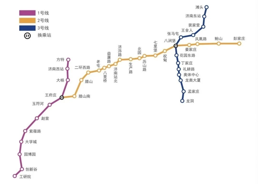 济南轨道交通1号线,线路起于工研院站,途经长清区、市中区、槐荫区,止于方特站,大致呈南北走向,共设工研院站、创新谷站、园博园站、大学城站、紫薇路站、赵营站、玉符河站、王府庄站、大杨站、济南西站、方特站。2015年7月开工,2019年元旦开通。济南轨道交通1号线的开通,使济南市进入“地铁时代”。济南轨道交通1号线最直接的带动作用就是对于轨道沿线片区开发的带动和西部、南部城区发展的拉动。随着其他线路的规划建设并融入城市血脉,城市运行及发展的交通支撑必将更加有力。